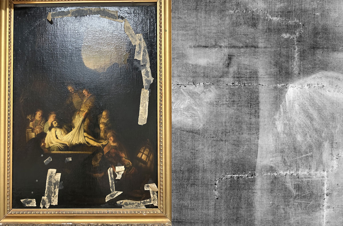 The investigations were primarily initiated by the Staatliche Kunstsammlungen Dresden (SKD), including requests from the Green Vault, the Albertinum, and the Old Masters Picture Gallery. Computer radiography was used to analyze works of art, including copies of Rembrandt‘s painting “The Entombment of Christ.” This resulted in valuable insights into the creative process behind the works. By comparing temporal characteristics, it is possible to determine whether certain details were added later. These characteristics include the quality of the canvas, painting techniques, materials, and paint. Especially the type of canvas can be determined and compared really well using X-ray images.