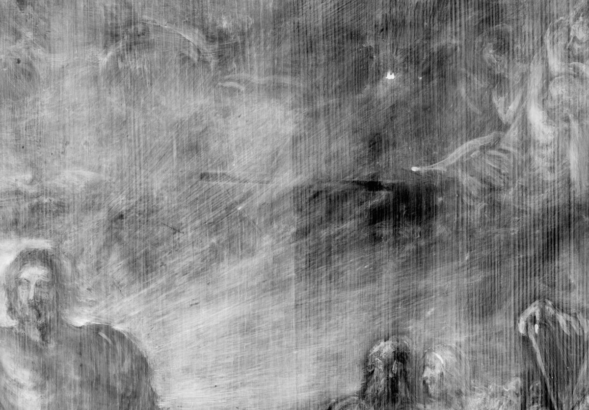 Detail of X-ray image: Peter Paul Rubens, The Last Judgment (copy); painting with highly absorbent lead white, visible wood grain, and a wooden dowel in the center; (Laura Princzes, SKD).